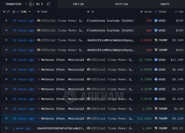 Des transactions on-chain remarquables provoquent de l’agitation autour de la memecoin TRUMP. Des portefeuilles associés à l’équipe officielle derrière le projet lié à la famille Trump ont transféré en décembre environ 80 millions d’euros en USD Coin vers Coinbase.