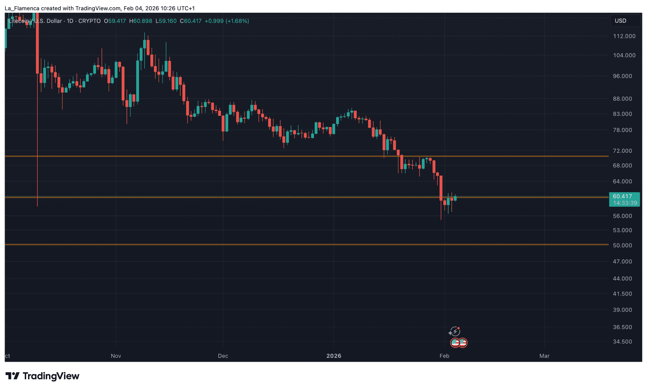 À ce stade, le litecoin se situe à environ 55 % en dessous de son sommet local atteint en octobre 2025.