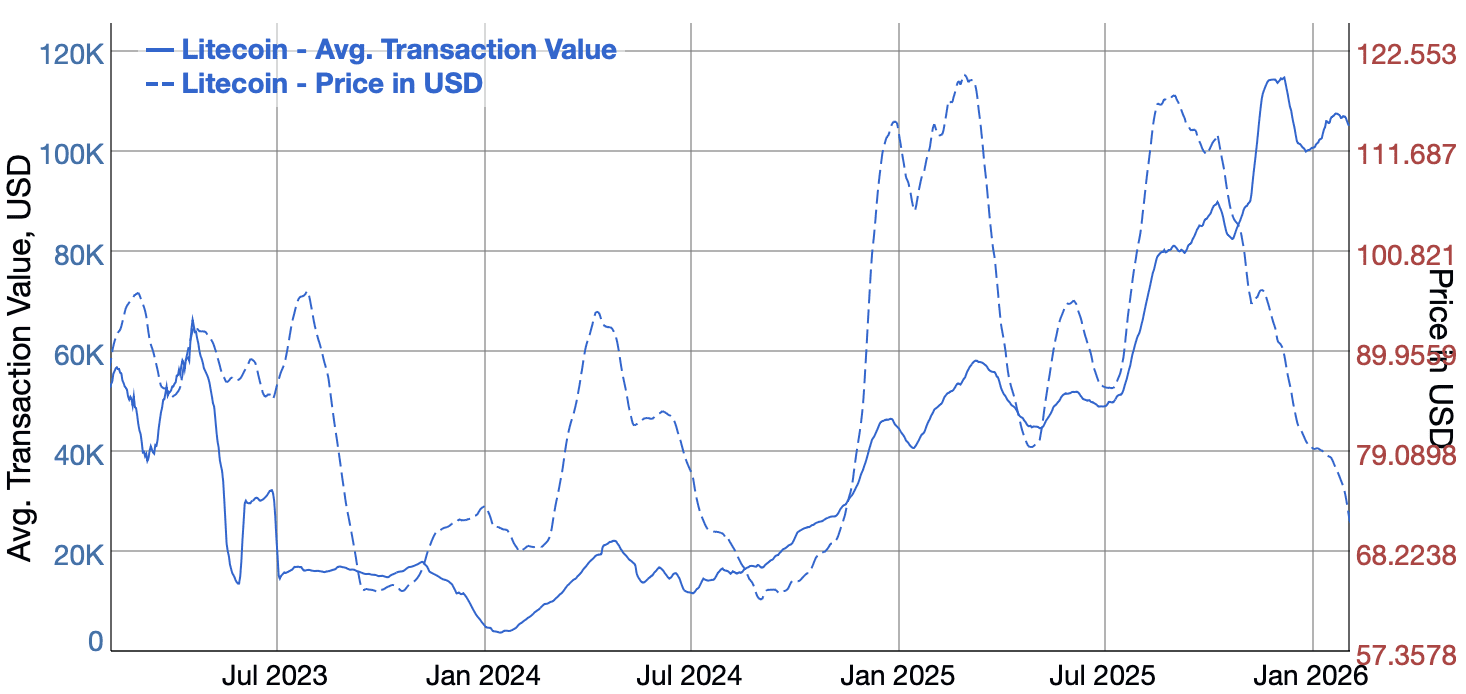 En temps normal, ces deux indicateurs évoluent dans la même direction. Or, depuis la fin de l’année 2025, le cours du litecoin a reculé, tandis que la valeur des transactions a, elle, augmenté.