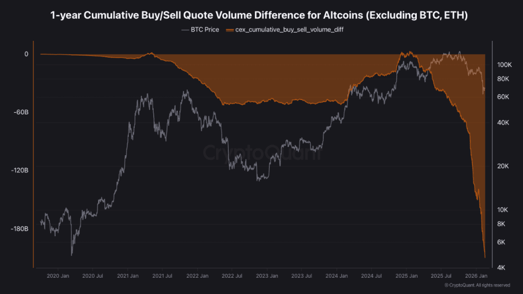 La pression vendeuse sur le marché des altcoins n’a jamais été aussi forte depuis cinq ans, affirme l’analyste IT Tech de CryptoQuant. Sur les treize derniers mois, environ 176 milliards d’euros auraient quitté le marché des altcoins.
