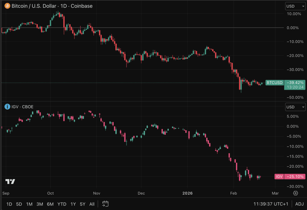 Depuis la dernière correction début février, ni le bitcoin ni les actions du secteur logiciel n’ont inscrit de nouveaux plus bas significatifs. Les deux semblent amorcer une phase de stabilisation.