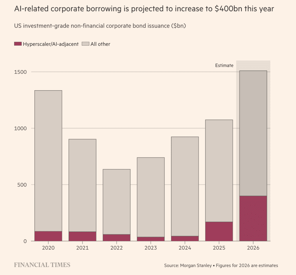 Les hyperscalers investissent des centaines de milliards de dollars dans des centres de données, des puces et des infrastructures énergétiques pour concrétiser leurs ambitions en matière d’IA. Morgan Stanley estime que ces entreprises, ainsi que les secteurs connexes, lèveront environ 400 milliards de dollars sur le marché américain des obligations de haute qualité en 2026. À titre de comparaison, ce montant n’était encore que de 44 milliards de dollars en 2024.