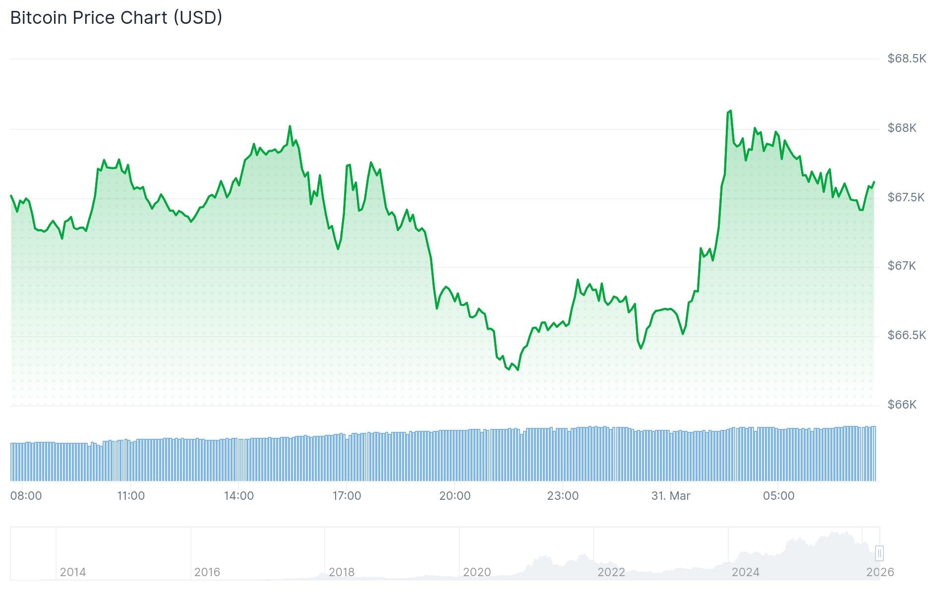 Au moment de la rédaction, le bitcoin évolue autour de 67.631 dollars sur OKX, soit environ 58.975 euros sur Bitvavo, quasiment stable sur 24 heures (+0,02 %).