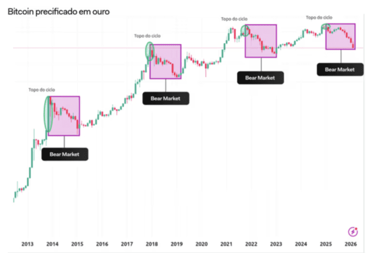 Mais en comparant le bitcoin à l’or, la dynamique diffère. Le sommet du ratio aurait été atteint dès janvier 2025. Sur la base des cycles passés, Szuster estime que le creux pourrait se situer autour de février 2026. Autrement dit, la récente chute vers 60 000 dollars en février pourrait déjà correspondre à un point bas potentiel.