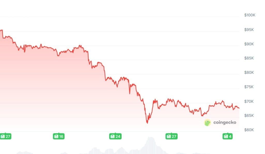 Plusieurs marchés financiers sont sous pression, et la crypto n’échappe pas à la tendance. La capitalisation totale du marché crypto a reculé de plus de 25 % au cours des quatre dernières semaines, sans véritable signe de reprise. Sur la même période, le bitcoin a chuté de plus de 26 %.