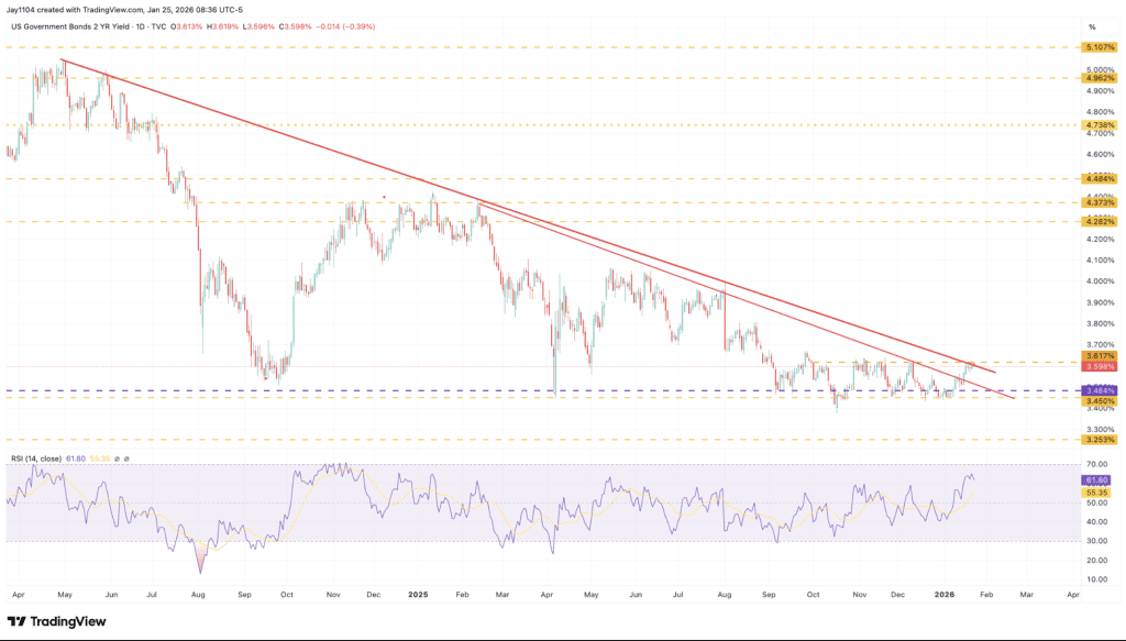 Une hausse du rendement américain à 2 ans est rarement une bonne nouvelle pour le bitcoin à court terme. Elle indique un durcissement des conditions financières, un dollar plus fort et moins de marge pour le capital spéculatif. Cela ne signifie pas automatiquement que le bitcoin va baisser, mais cela rend une forte cassure haussière plus difficile.