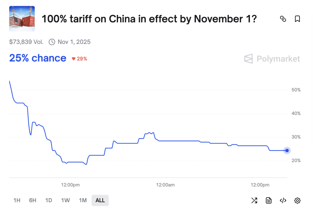 Par ailleurs, sur Polymarket, la majorité des parieurs ne croient pas que les nouvelles taxes douanières annoncées par Trump, censées entrer en vigueur le 1er novembre 2025, seront réellement appliquées.