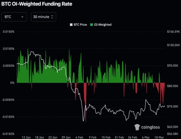 Sur le marché des futures, les traders paient des frais spécifiques. Lorsque ces frais sont négatifs, comme c’est le cas actuellement, cela signifie qu’il y a davantage de positions à la baisse que de positions à la hausse. Ces frais sont négatifs depuis le 10 mars.