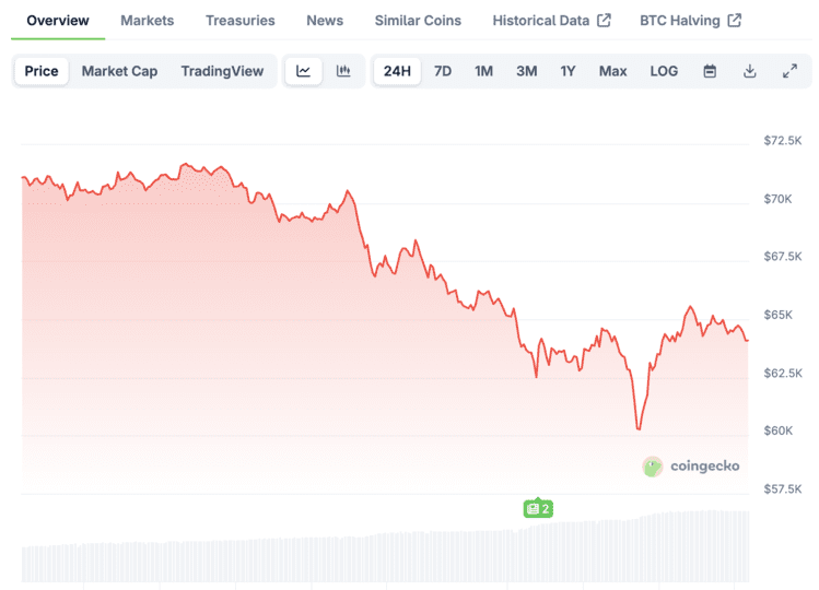 Le cours du bitcoin a fortement chuté ces derniers jours et est même brièvement descendu vers 60 000 dollars hier. Au moment de l’écriture, le prix évolue autour de 64 000 dollars, ce qui montre que la pression sur le marché reste clairement perceptible. Le cours se situe ainsi de nouveau en dessous du sommet atteint en 2021.