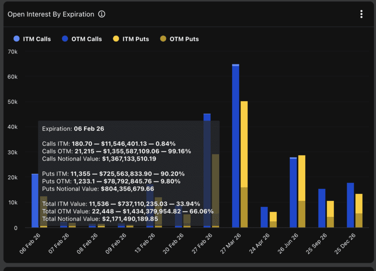 Le Bitcoin a fortement chuté ces derniers jours, tombant brièvement à 60 000 dollars. Source : CoinGeckoPourtant, le marché des options montre une image différente. Les options d’achat (calls) représentent toujours une part importante du volume ouvert. Cela signifie qu’une partie des traders anticipe des prix plus élevés à un stade ultérieur. Pour l’instant, cette confiance ne se reflète toutefois pas encore dans l’évolution du cours.