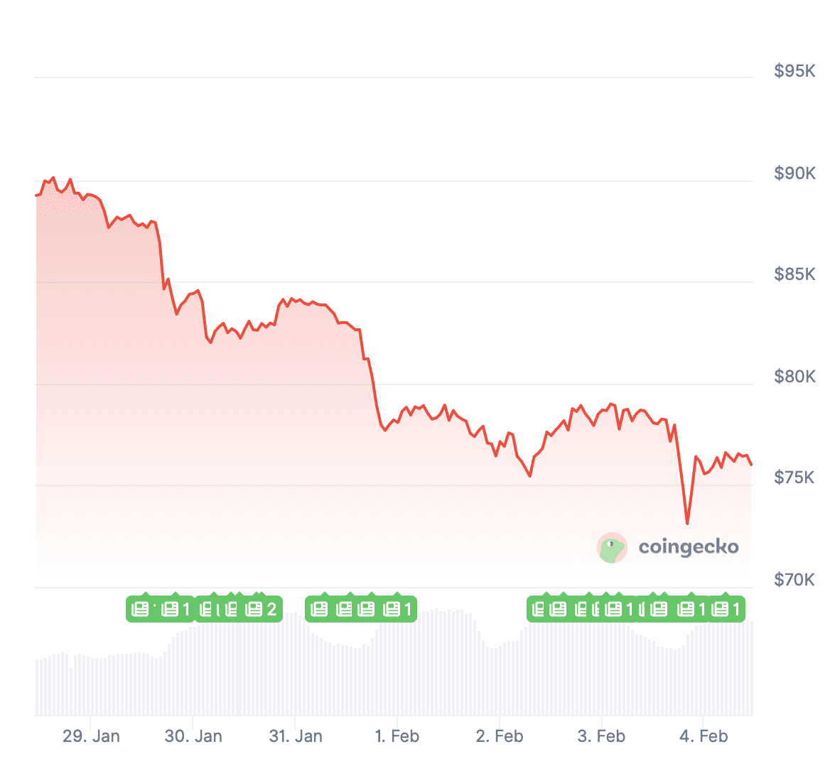 Au cours des 24 dernières heures, le bitcoin a encore baissé de 3 % et, au moment de la rédaction, la cryptomonnaie s’échange à 76 019 dollars (64 787 euros).