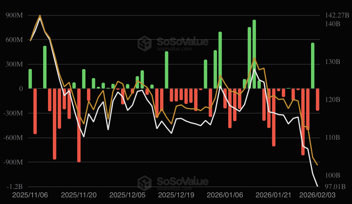 Pour la première fois depuis longtemps, le total des actifs détenus dans les fonds indiciels bitcoin est passé sous la barre des 100 milliards de dollars. Ce seuil avait été atteint pour la première fois en avril 2025.