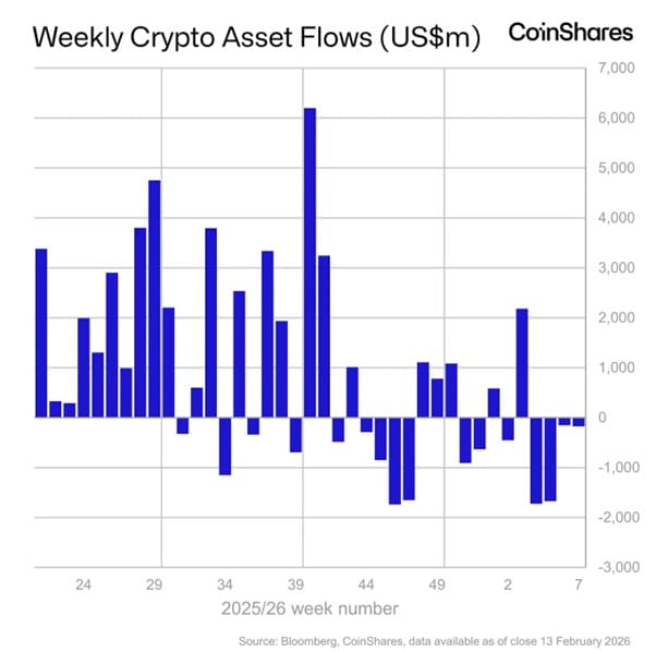 Flux hebdomadaire de capitaux vers les produits d’investissement cryptographiques cotés en bourse. Source : CoinShares.