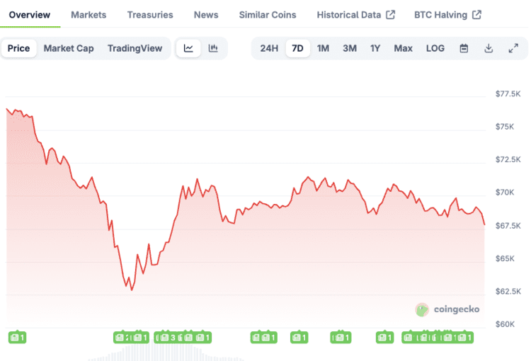 Le cours est brièvement tombé autour des 60 000 dollars et évolue actuellement aux alentours de 67 000 dollars.