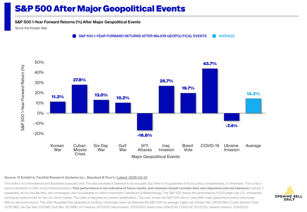 Le marché actions dans son ensemble ne montre pas non plus de signes de panique. Historiquement, les actions américaines ont affiché en moyenne une hausse de plus de 14 % dans les douze mois suivant de grands chocs géopolitiques depuis 1950.