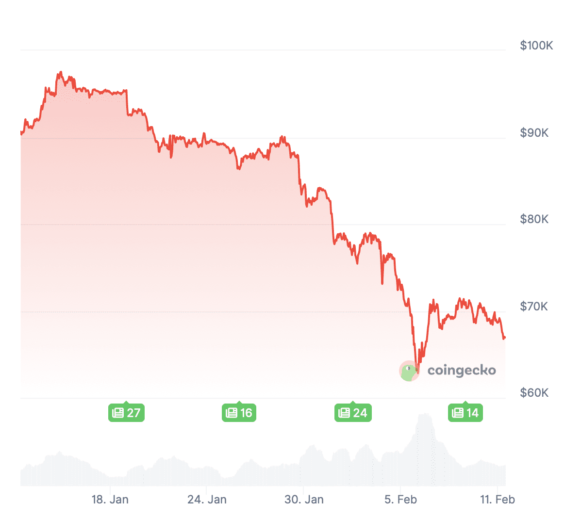 Le cours du bitcoin a chuté de 26 % au cours du mois dernier et la cryptomonnaie s’échange désormais autour de 66 900 dollars.