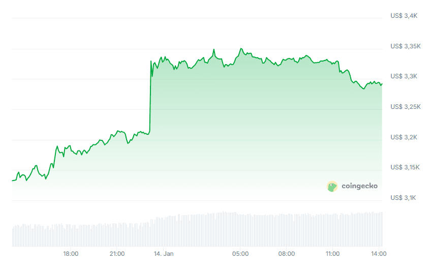 Le cours de l’ethereum a augmenté de 5 % aujourd’hui pour atteindre 3 292 dollars, après une forte hausse hier soir.