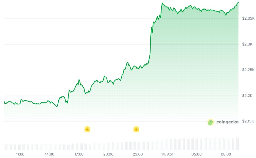 L’ethereum fait encore mieux : son cours grimpe de 8,8 % à 2 382 dollars.