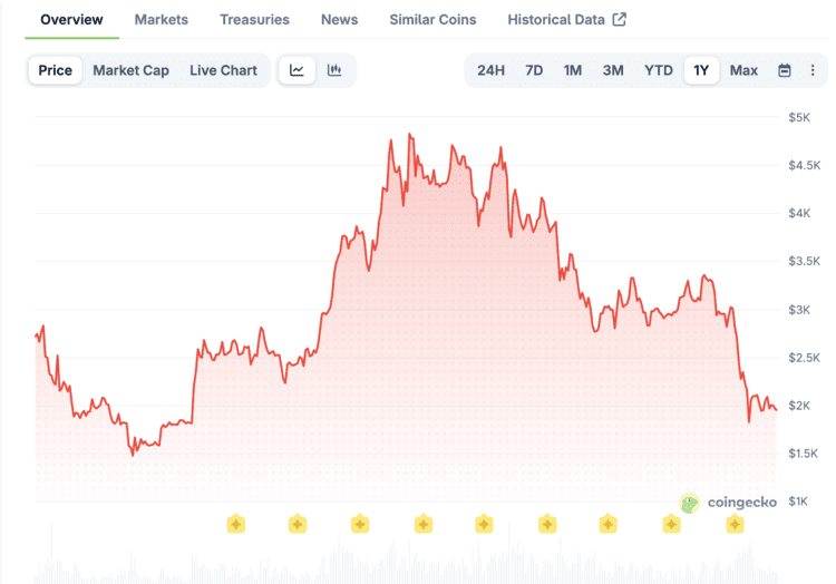 Malgré ces avancées techniques, l’ether évolue toujours nettement sous ses sommets historiques. Le cours oscille actuellement autour de 1 950 dollars, soit environ 60 % en dessous de son record absolu.