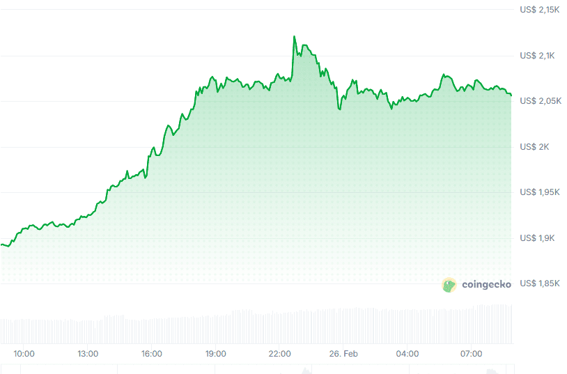 Le cours de l’ethereum a grimpé de 8,5 % en 24 heures pour atteindre 2 054 dollars.