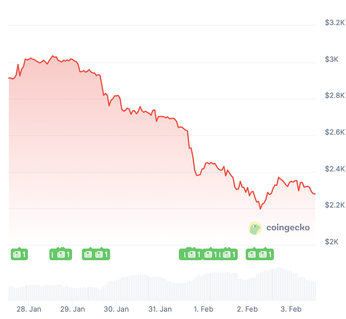 Graphique du cours ETH/USD des sept derniers jours. Source : CoinGecko.