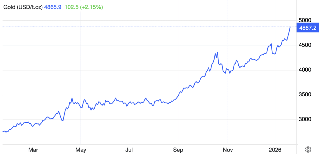 Depuis le 1er janvier, le prix de l’or a encore gagné 14 %, pour atteindre environ 4 865 dollars par once troy. Il s’agit du plus haut niveau jamais atteint.