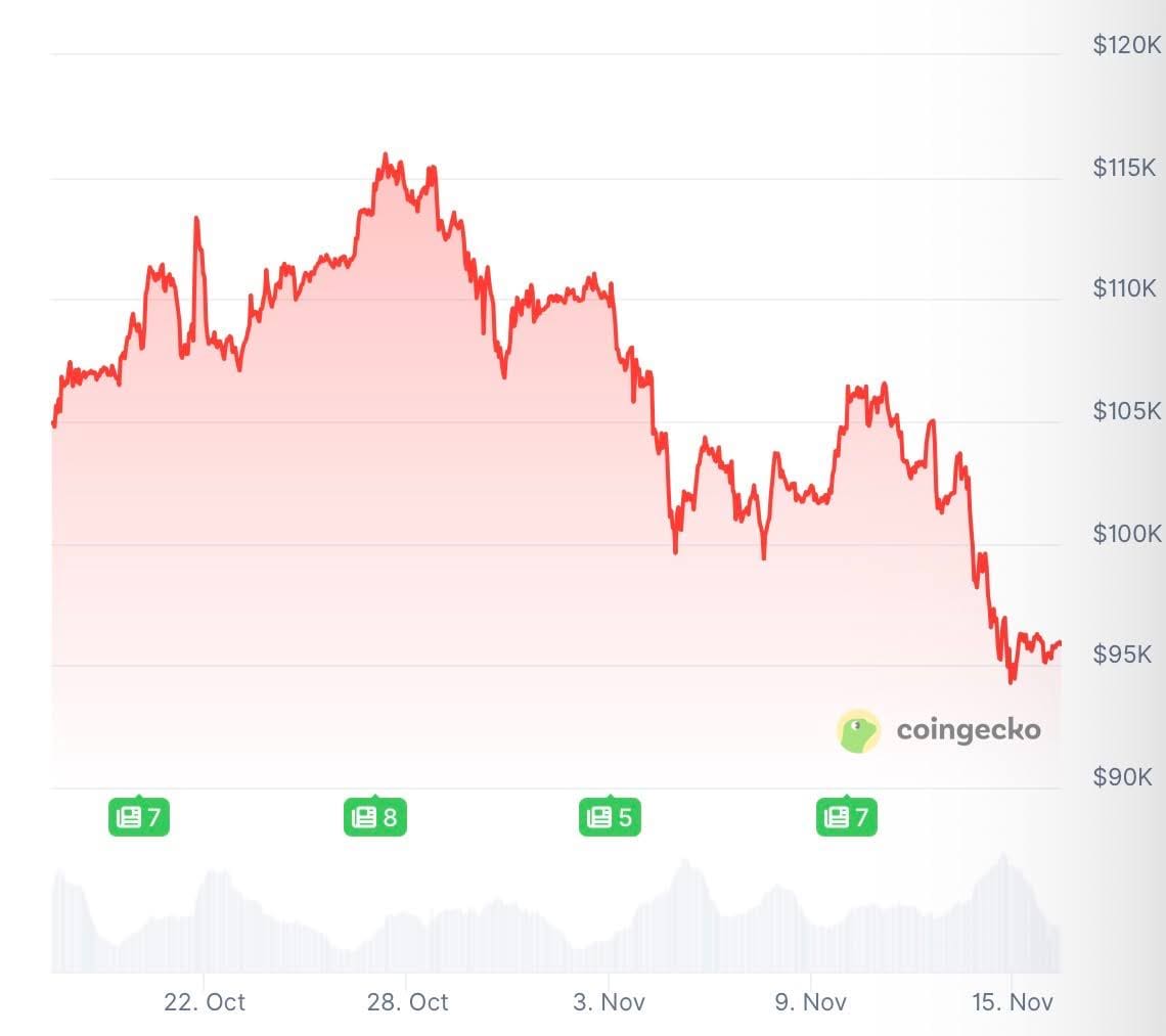 Le bitcoin aurait bien besoin d’un signal positif tel qu’une baisse des taux. Ces derniers jours, son cours est passé sous le seuil symbolique des 100 000 dollars, et s’échange actuellement autour de 95 856 dollars.