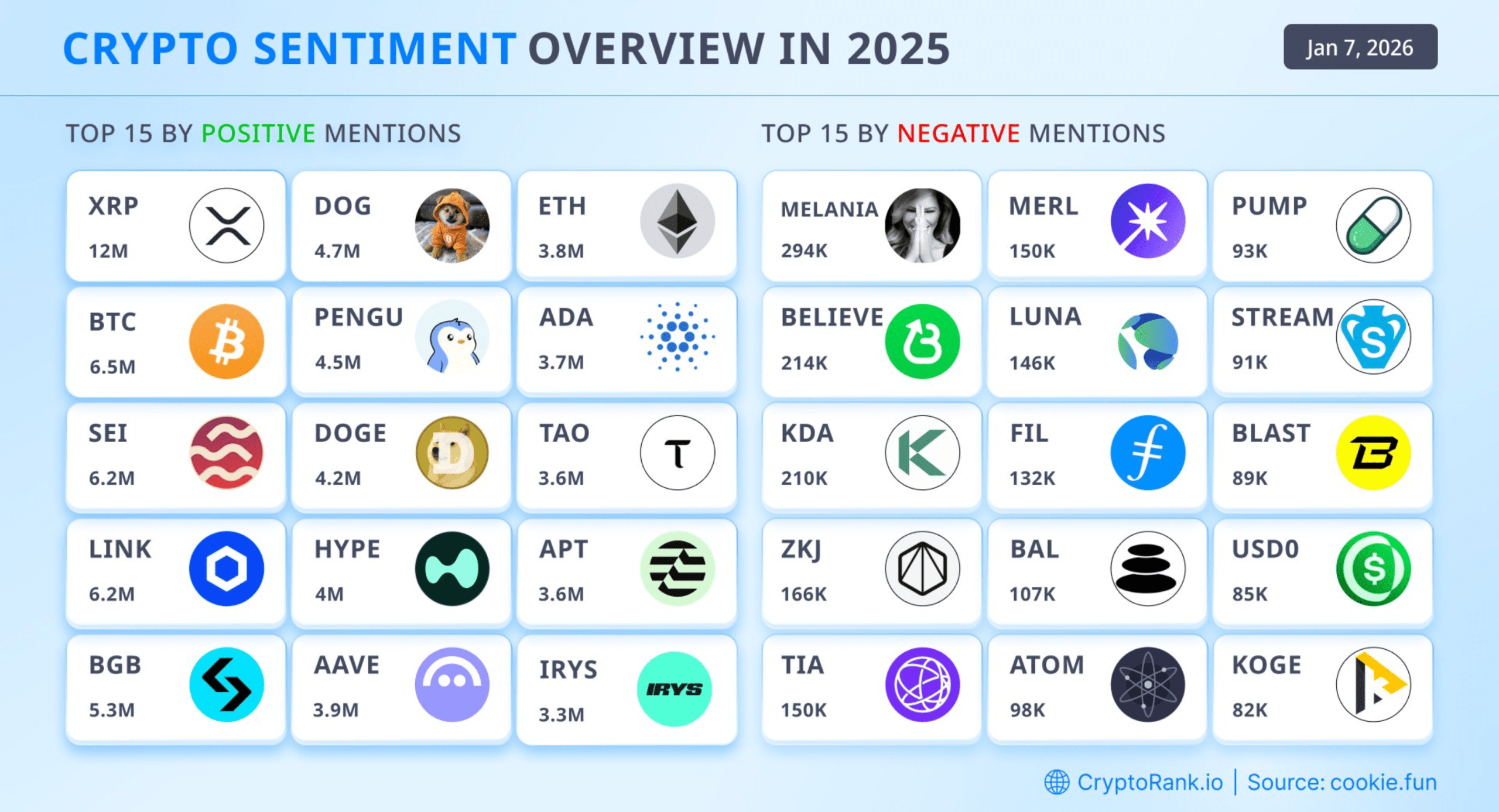 D’après les données de CryptoRank, le XRP était début 2026 la cryptomonnaie faisant l’objet du plus grand nombre de mentions positives, devant le bitcoin et SEI.