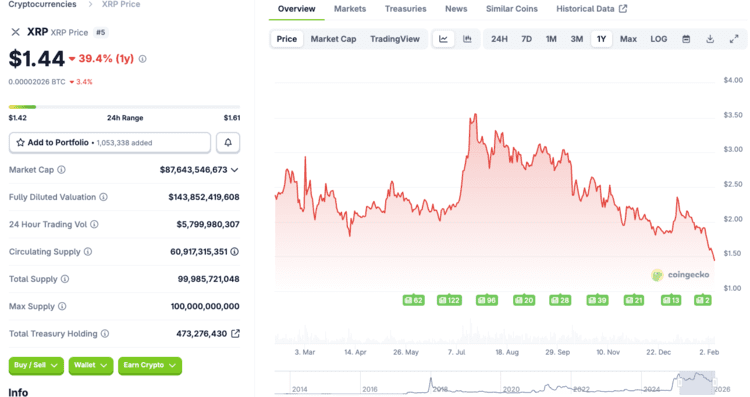 Le XRP a reculé d’environ 10 % aujourd’hui et s’échange autour de 1,44 dollar. Il s’agit de son niveau le plus bas depuis novembre 2024.