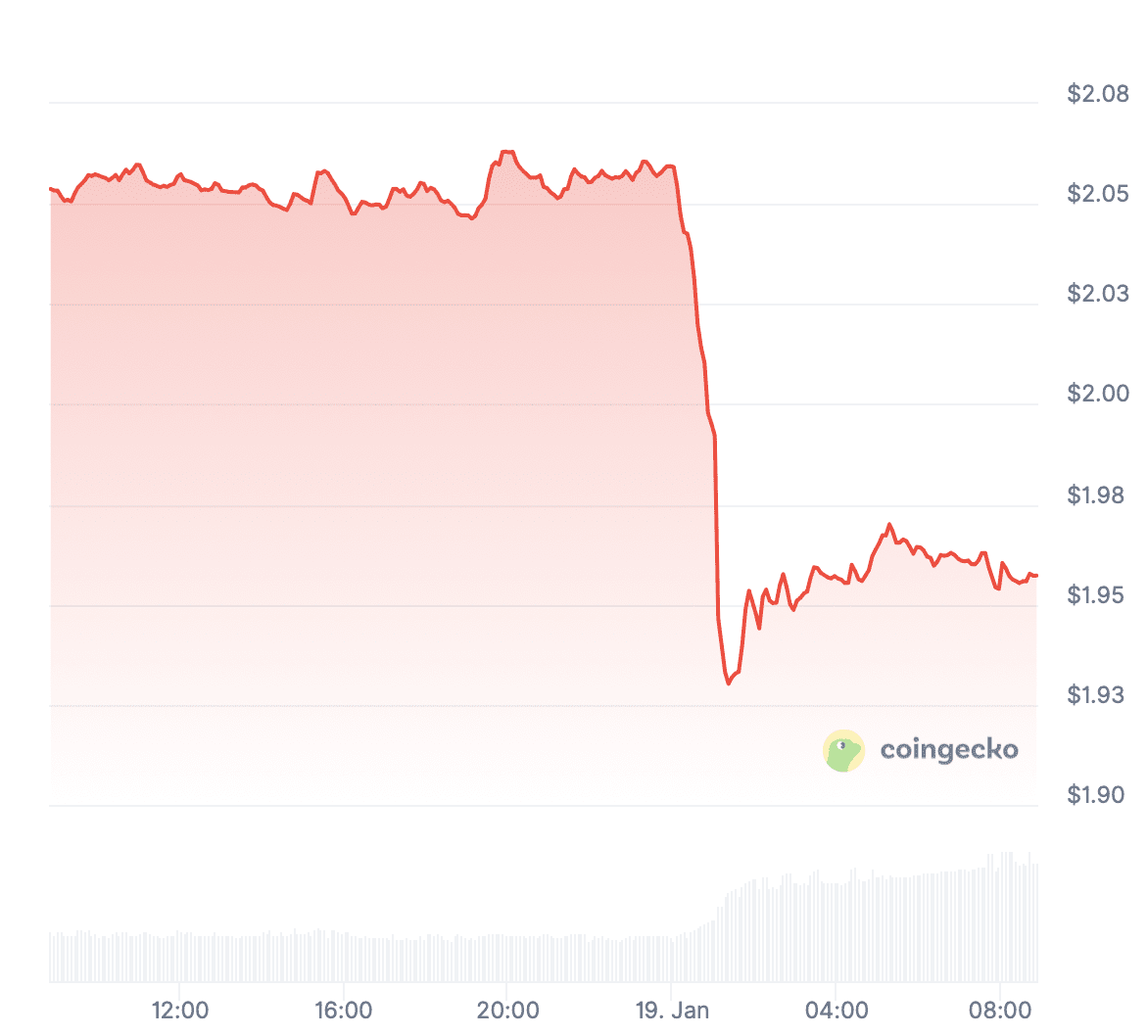 Le cours du XRP a fortement décroché au cours de la nuit. En l’espace de seulement deux heures, le prix a reculé d’un peu moins de 10 %, atteignant un point bas à 1,85 dollar. Depuis, le cours s’est légèrement stabilisé autour de 1,95 dollar.