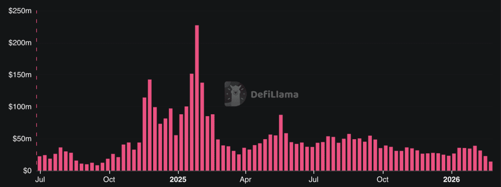 Par ailleurs, les revenus issus des applications décentralisées (dApps) sur le réseau Solana ont chuté d’environ moitié ces dernières semaines. Ils sont désormais comparables aux niveaux observés il y a un an et demi.