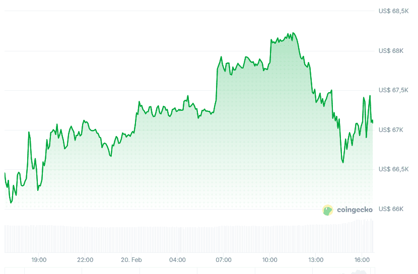 Au moment de la rédaction, le cours du bitcoin évolue autour de 67 002 dollars. Cela représente une hausse d’environ 2 % au cours des dernières 24 heures. Exprimé en euros, le prix s’établit à 56 707 euros, soit une progression plus modeste de 0,7 %.